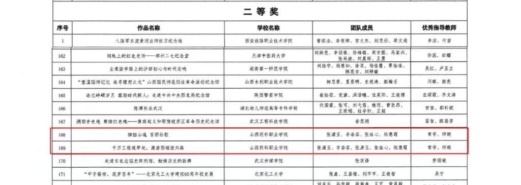在第四届全国大学生红色全景资源创意展示大赛中,我院马克思主义学院报送的多项作品荣获佳绩。其中,常宇、师婉老师指导的《狮脑山魂百团壮歌》《千万工程筑梦处,漫游西磑振兴路》荣获二等奖;药飞飞、弓宇琛、任俊峰老师指导的《全景西沟红:党旗映红心,劳模践使命——奋斗精神的百年回响》,葛蕾、白婷婷老师指导的《赤帜凌云承遗志 薪火长燃照新程》,药飞飞、贾晋霞、常宇老师指导的《石拐会议:太行烽火中的红色决策地》,贾晋霞老师指导的《晋土红韵·全景丰碑》荣获三等奖,获奖作品居全省同类院校前列。