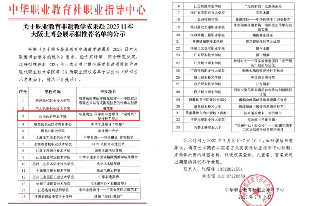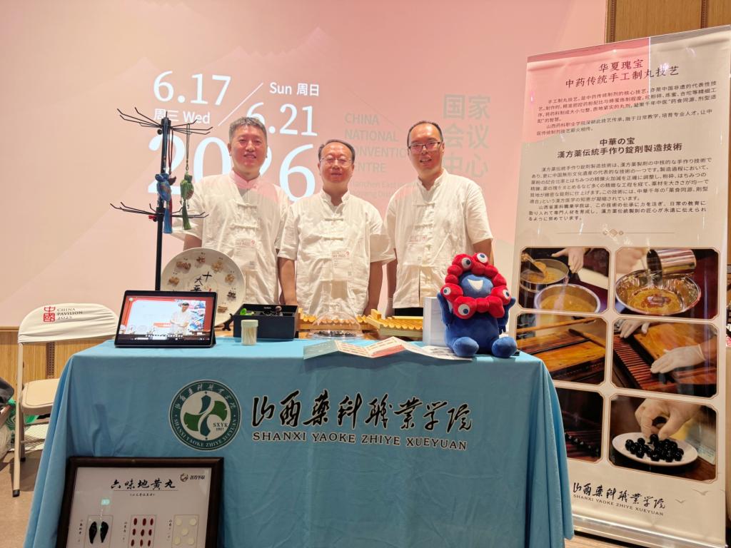 作为本次赴大阪世博会展示的山西省唯一一所职业院校,山西药科职业学院的展示不仅是自身非遗教学成果的输出,更成为山西职教传承中华优秀传统文化的“窗口”。中药传统手工制丸技艺是中医药文化的重要载体,山西药科职业学院长期将传统技艺融入中药类专业人才培养,开设《中药制剂技术》《非遗技艺传承实践》等课程,组建“非遗技艺传承工作室”,获评2个“全国老药工传承工作室”,牵头成立国家级培育支持的黄河流域中药材产教融合共同体,立项建设教育强国项目——中药材产教融合实训基地,等等。此次活动正是山西药科职业学院多年职教非遗传承成果的集中展示。